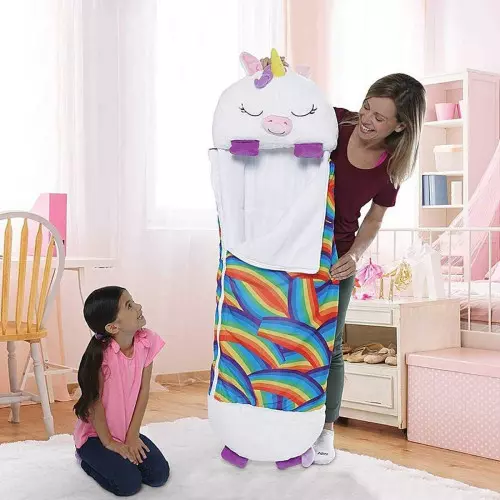 Освен че възглавницата е забавна и перфектна за игри, когато дойде време за дрямка, тя може да се трансформира в спален чувал за секунди.